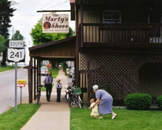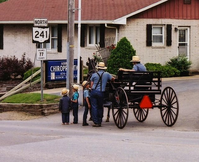 Here is a roadside discussion between two Amish fathers and several barefooted boys. They are parked in front of a chiropractor's office, but I don't know if they went inside that day. Amish people do favor chiropractors, it seems, as well as folk remedies and herbals. But who knows, maybe today they were talking about baseball. Many of the Amish people I have met like that, too.