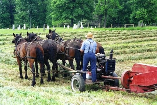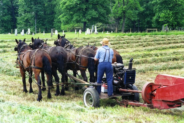 Here is an Amish man whose bishop has ruled that hay balers are permitted. Farmers like this one are still obliged to use horse power, but as is often the case, some modern machines are now permitted. It all depends on what the bishop in a particular congregation has decided.