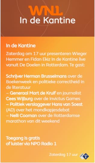 RT @WNLInDeKantine: Morgen weer een fantastische line-up, in @dedoelen Studio!@FidanEkiz en @wiegerhemmer ontvangen Herman Brusselmans, @HansvansoestAD, Mart de Kruif, @CeesWijburg & de legendarische Nelli Cooman.Van 17-19u bent u welkom als bezoeker of als luisteraar, live op @NPORadio1! #WNL