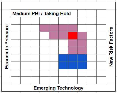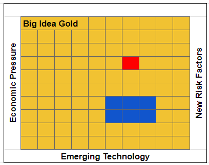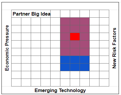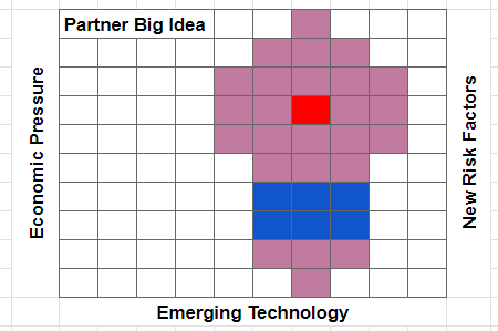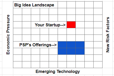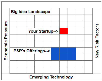 You’re ahead of the curve and the product you’re working on anticipates this emerging reality. The PSP also has a set of offerings that are highly relevant to the emerging reality. To frame the new reality grid we’ve selected three major market forces (just examples): Economic Pressure, Emerging Technology, New Risk Factors. Your new startup is well positioned close to the center of these market forces - but is just the start - it’s one box in a giant grid of opportunity.