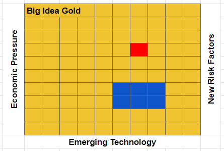 Let’s start with a visual. Imagine you could create a graph of the key aspects of how the world will be in a future state. A grid of how the world will look, say, five years from now. It’s probably more like a multi-sided object, but given that we’re working in two dimensions here, we’ll keep our thinking confined to a two dimensional space. On the axes of this grid are the key drivers of the future state. The axes may be new customer needs, emerging technologies, looming regulatory changes, shifts in society, economic pressures, or a blend of all of them (and more). These forces are creating a big new reality.