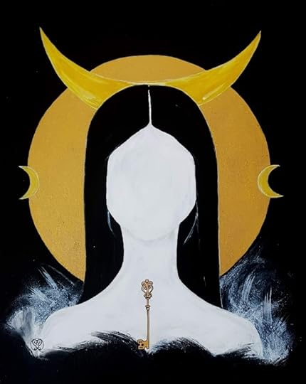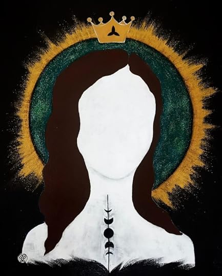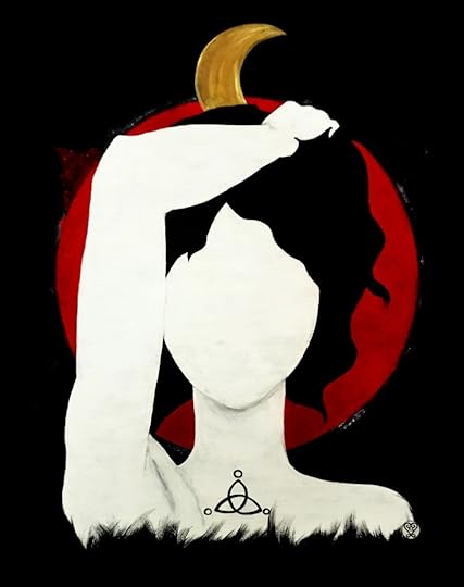 There’s no serpent, no wings, she’s just a woman. A woman slandered, a woman just trying to be herself. Behind her is the blood moon, or the red of a lunar eclipse. Above her head, crowning her, is a crescent. Poking out from behind her like a dragon’s tooth, it reminds me of advice I once heard. “Be like the dragon. Can you imagine a dragon being afraid?”