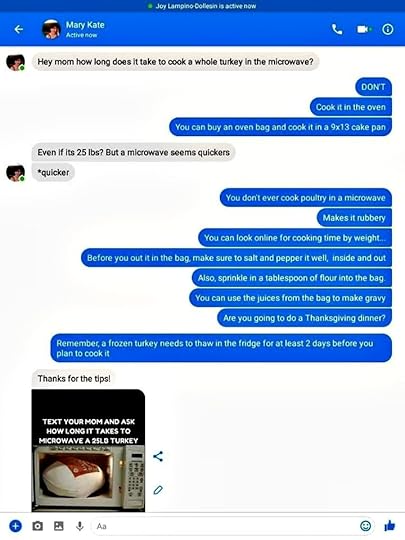I hear the familiar ding of my phone and look down to see a message from my 21 year-old daughter, “Hey mom how long does it take to cook a whole turkey in the microwave?” I immediately reply with, “DON’T”…followed by a list of maternal advice.