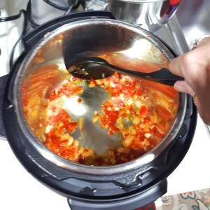 Use the Instapot saute function. Add olive oil, butter, diced garlic, onions and red peppers. Saute until soft.