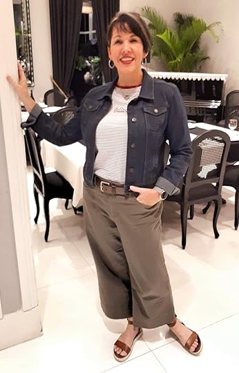 This evening I wore a casual outfit of olive gaucho pants and a denim jacket. I enjoy pairing denim and olive because it breaks up the typical denim on denim routine.