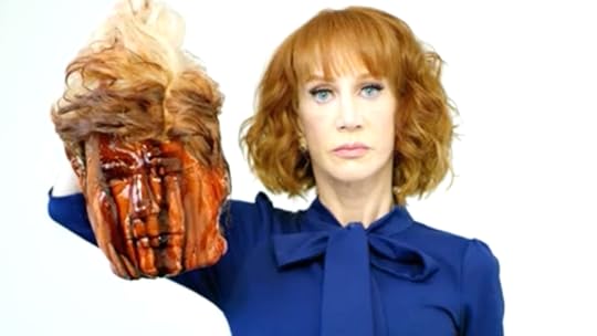 Comedian Kathy Griffin holds up a severed head of the President of the United States. “Edgy” she calls it, “art”.
