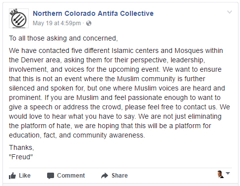 Northern Colorado Antifa seeks support from Islamic groups.