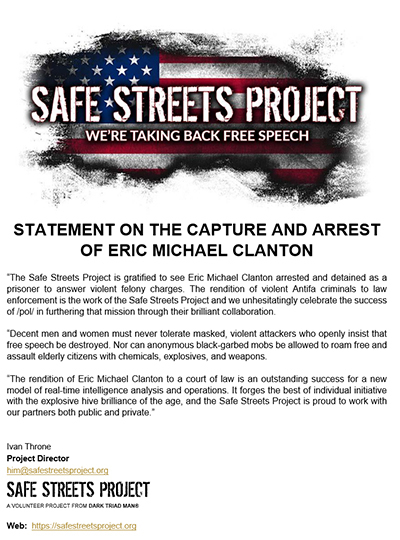 The Safe Streets Project is in touch with rising ground organizations across the United States such as the Proud Boys and the Fraternal Order of Alt-Knights that work to defend decent men and women from criminal attacks, thrown explosives and wholesale property destruction by Antifa and Black Bloc groups.