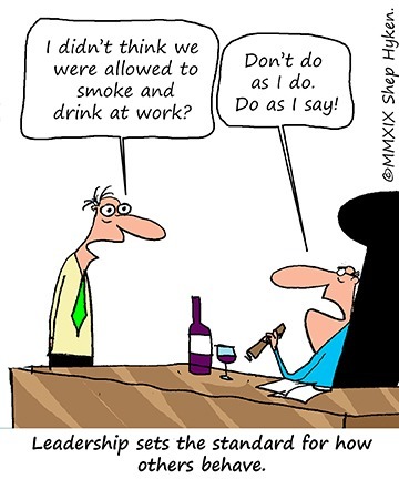 Leadership sets the tone. They are the role models for the rest of the employees. They can’t demonstrate an attitude of, “Do as I say, not as I do.” Everyone’s eyes and ears are focused on their leadership. If you are a leader – or in a position that may influence others – how do your behaviors and attitudes reflect the essence of how others act? Even if you aren’t a president or CEO, you can set the standard for how you want those around you to behave.