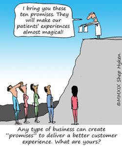For those that didn’t read the article or watch the video, Dr. Neil Baum is a world-renowned urologist. He not only prides himself on being an excellent doctor, but he also prides himself on delivering a great patient experience. I’m sharing his personal promise, and as you go through this list, keep in mind three things. First, this is a promise about the experience you’ll get when visiting his office, which is all about customer service. Second, notice how he’s working convenience into the promise, like how he arranges for prescriptions to be waiting for you when you arrive at the pharmacy. Third, he obviously cares. How many doctors give you an email address and promise to respond the same day?