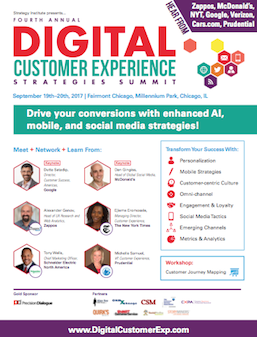The above contributors will all be speakers at the 4th Annual Digital Customer Experience Strategies Summit at the Fairmont Chicago, IL September 19-20, 2017. The event is a one-stop-shop for all the freshest cross-industry insights into innovations in mobile, social, AI, personalization, VoC and big data. Speakers include Google, McDonald’s, Twitter, Verizon, Salesforce, Comcast and many more. To find out more about the summit please visit the website: www.digitalcustomerexp.com