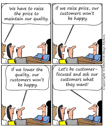 But, what about a tough decision that a company knows will not be received well by the customer, such as a price increase? Raising prices may not make the customer happy, but what if the company doesn’t take this action? If the price doesn’t go up, in order to continue to sell the same product profitably, something else may have to give. Not raising the price might mean a compromise in quality or service. The choice to raise prices, even knowing the customer will not be happy, may have to be done. Or maybe it’s a decision about something behind the scenes that the customer won’t see, but may still may have a negative impact on the customer, maybe even worse than the customer’s concern over a price increase. But these decisions are always made with the customer in mind, even if we know they are not going to be positively received by the customer.
