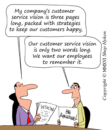 When it comes to your customer service promise and vision, every member of your organization must be in alignment. Everyone must understand it, and ideally if it’s short, it should be memorized. It must be part of your culture, and everyone must be trained to not only understand what it means and how it impacts the customer, but also how to deliver and live up to the standards needed to deliver on the promise.