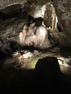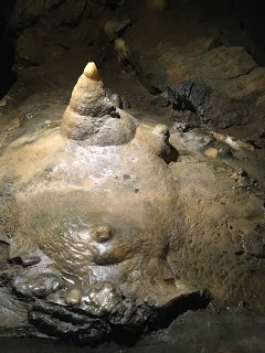 Our guide called this, 'The Upside Down Ice-Cream Cone'. Under a display of carefully placed lights, students can view stalactites, stalagmites, flowstone, rimstone and other visual wonders, up close and personal, as long as they don't touch anything. Human hands diminish the luster of the stone.