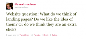@AnaFarrish – I don't like [splash pages], especially if they have flash or a movie, or something else I have to skip to get where I want to go.