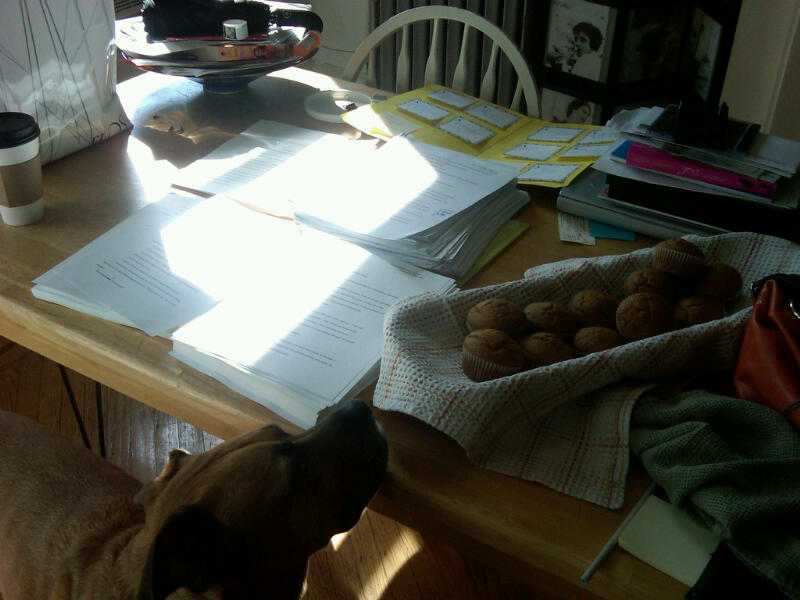 This morning I woke up ridiculously early to work, only to be overcome with an intense desire to make pumpkin muffins. Now, to be fair, I have a weakness for pumpkin-flavored everything (except, oddly, pumpkin pie, which I've never understood because it's cold and has the consistency of baby food), so it's no surprise that with autumn in full swing outside my window, I want pumpkin muffins. But today, this was as much about me resisting the revision process as it was about cooking (see image for muffins, manuscript and possible muffin thief).