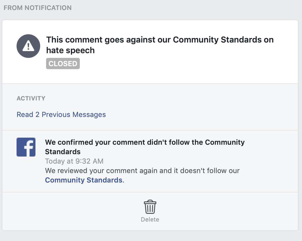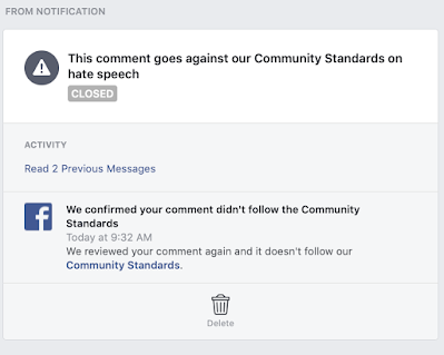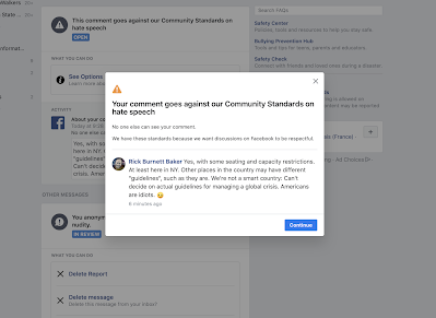 Yes, I was warned by the FB police in August that a comment I wrote on a friend’s post were in violation of their policies against “hate speech.” I wrote an egregious response on a friend’s post, answering a question about whether restaurants were open here in the US. But Facebook’s sanctimonious AI programs picked-up on the words “American” and “idiots” in the same sentence. Lord have mercy.