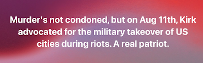 My comment was, “Murder’s not condoned, but on Aug. 11th, Kirk advocated for the military takeover of US cities during riots. A real patriot.” That damned conjunction “but”!