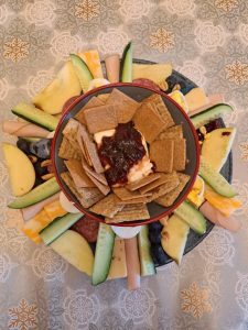 ↑ ↑ My snack board incorporated a mini gouda wheel and mini Triscuits in the foreground. Jane’s design echoes the snowflakes on the tablecloth. (Or wrapping paper, or whatever that is — I was focused on the food and forgot to ask!)
