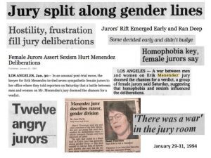 On Saturday, 1/29/94, Leslie Abramson, “her girls”, and a handful of trusted journalists (trusted to be fair and not prosecution-biased, that is), including Robert Rand and Linda Deutsch, gathered in her law office for a press conference. News of Erik’s jury room gender split made headlines across the country on Sunday, 1/30/94, but I didn’t know that until many years later.