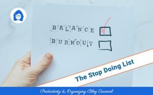 Shout out to Julie Stobbe, who suggested creating a “Happiness Stop Doing List” in her contribution to the most recent Productivity & Organizing Blog Carnival (POBC). Each month my Canadian website caregiver and designer, Janet Barclay, curates a collection of blog posts on a different theme. Julie didn’t have “stop watching bad news” on her list (I added it in a comment), but it nonetheless triggered the idea for this blog post, as well as a number of other things going on lately in conversations I’ve had. The whole September POBC issue — The Stop Doing List — is great! (Note that the image aptly depicts a choice between balance and burnout.) I loved seeing how each blogger approached the topic from a different angle. (My contribution was Just say no. Here’s how and why.)