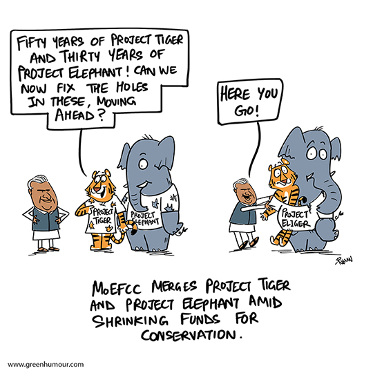 Conservation news that doesn't make headlines: Project Tiger and Project Elephant have recently been merged. Cartoon for my column with The Hindu Sunday Magazine.