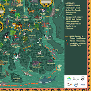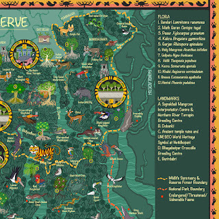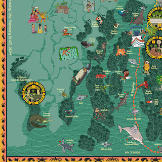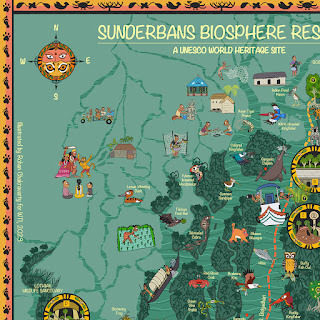 This map of the Indian fraction of the Sunderbans (a majority of the mangrove forest is in Bangladesh) attempts to present the major flora and fauna species that share the delta with humankind, making the mangrove and tidal ecosystems and their people an interdependent component in their own right. The art style in the map pays tribute to rural Bengal's Patachitra art, while the compass is a homage to the legend of Bonobibi and Dokhhin Ray, a thread that binds humans and nature in a tightly knit web. A few snippets from the map are below.