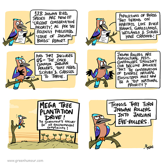 An Indian Roller reads out the key findings of the recently published 'State of Indian Birds' report. Comic from my column in The Hindu Sunday Magazine.