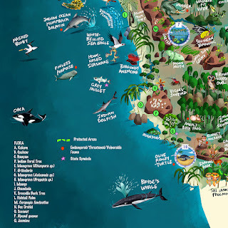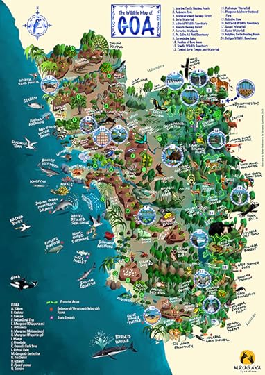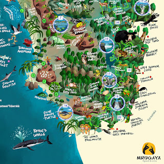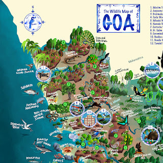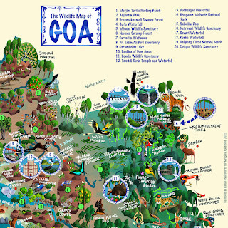 Explore Goa's biodiversity with the Wildlife Map of Goa, illustrated for Mrugaya Xpeditions, an ecotourism and conservation education organization in Goa run by one of the best naturalists I know, Mr. Parag Rangnerkar. For prints, write to info@mrugayaxpeditions.com . Here are a few snippets from the map (click for a larger preview):