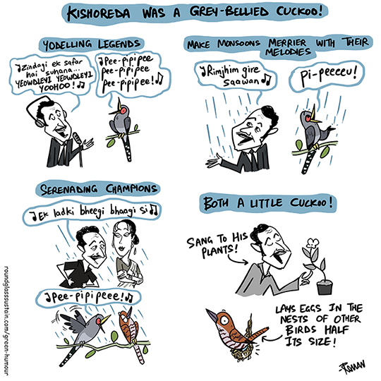 Kishore Kumar was a Grey-bellied Cuckoo! What are your favourite Kishoreda songs? Drop them in the comments. Comic from Roundglass Sustain celebrating monsoon and the bird of the season!To read a similar strip about Mohammad Rafi and the Magpie Robin, visit Roundglass Sustain here.