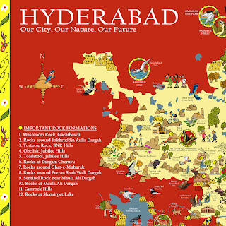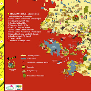 (click for a larger view)Hyderabad's rock formations, older than the Himalayas, may well be a hindrance to real estate developers, but for biodiversity and nature enthusiasts, these very rocks are what makes the city's biogeography unique! Here's a map of the real 'pearls' of the Pearl City, its biodiversity.