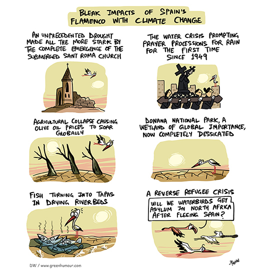 A look at the impacts of Spain’s flamenco with climate change, as it prepares to brace the worst drought in decades. Comic for DW Global Ideas.