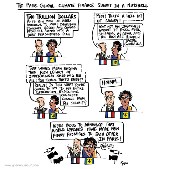 The recently concluded Paris Global Climate Finance Summit in a nutshell, starring French President Emannuel Macron and Barbadian Prime Minister Mia Motley. Comic from my column with The Hindu Sunday Magazine.