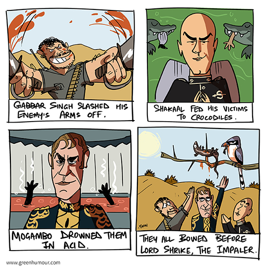 (For my readers from the West, Gabbar Singh (played by Amjad Khan) from the film Sholay, Shakaal (played by Khulbhushan Kharbanda) from the film Shaan, and Mogambo (played by Amrish Puri) from the film Mr. India, are three of the most iconic Hindi film villains of all time).