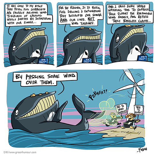 Fossil fuel lobbies are using whale deaths as a ruse to protest against wind energy in the USA! I normally don’t make flatulence jokes on principle, but this time the pun was too hard to resist. Comic for DW Environment. Read more on DW here.