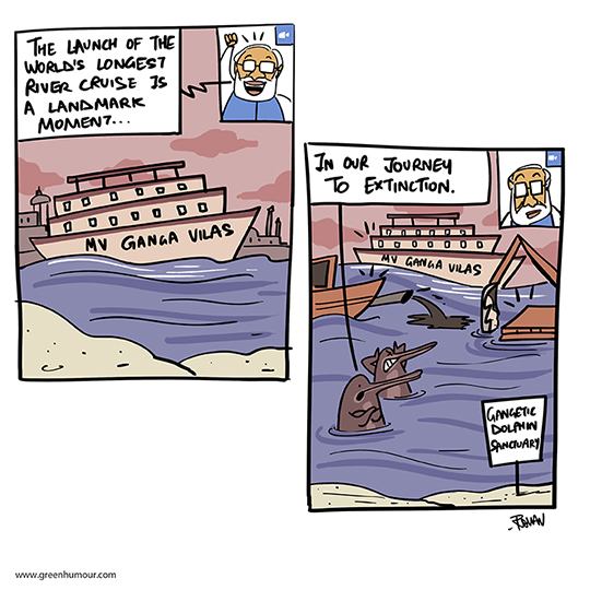 Dredging and noise pollution associated with the newly launched luxury cruises in the Ganga are expected to make the already critical situation for Gangetic Dolphins a lot worse. Endangered and threatened by pollution and habitat loss, the Gangetic Dolphin is India's National Aquatic Animal.
