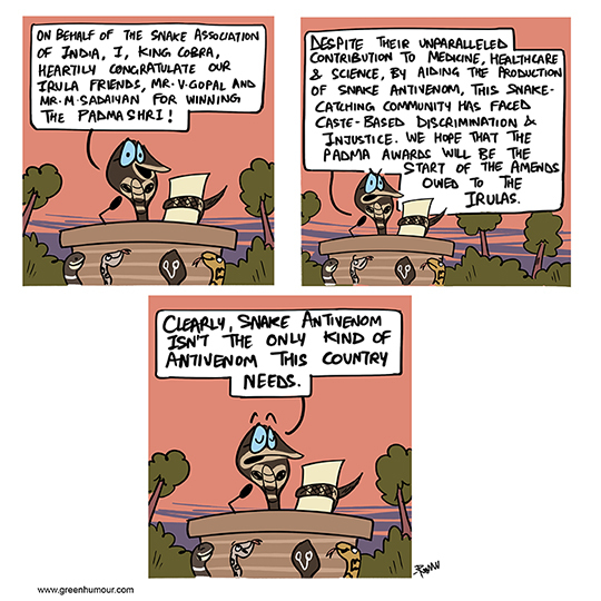 The comic appears in my column with The Hindu Sunday Magazine. A couple of years back, I wrote and illustrated a short comic book on snakebite awareness called ‘Making Friends with Snakes’ in collaboration with the Madras Crocodile Bank Trust and renowned herpetologist Mr. Romulus Whitaker, which is available via Pratham Books and Storyweaver. The book was a recipient of the Green Literature Festival Award, 2021.