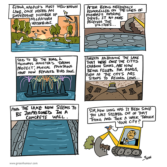 Futala Lake, among my hometown Nagpur's most famous landmarks, was once the wintering ground for migratory waterbirds and waders. Today it is marked by a concrete embankment, a musical fountain, and deforestation along its peripheries. Activists and environmentalists from the city have been campaigning against this transformation.