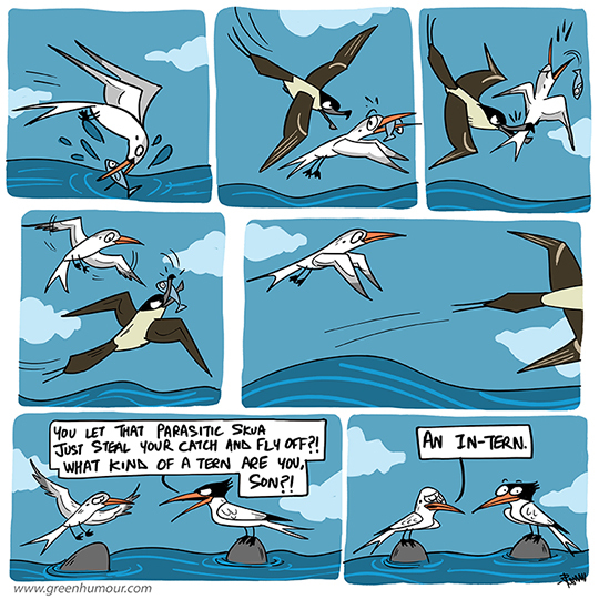 A dad joke about skuas kleptoparasitising on terns, with apologies to interns reading this. Comic from my column with Roundglass Sustain.