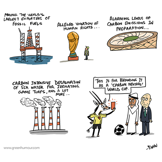 Qatar's national animal, the Arabian Oryx gives the 2022 'carbon neutral' FIFA World Cup a red card. Cartoon from my column with The Hindu Sunday Magazine.