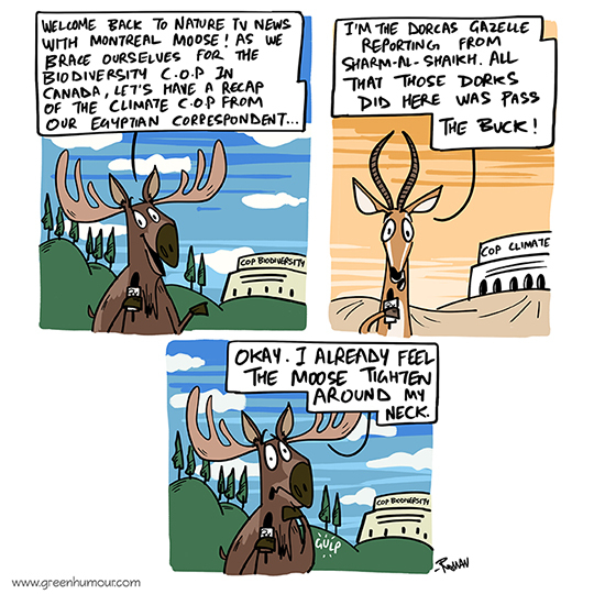 A Moose from Canada and a Dorcas Gazelle from Egypt discuss COP Biodiversity and COP 27 on Nature TV News. Comic from my column with The Hindu Sunday Magazine.