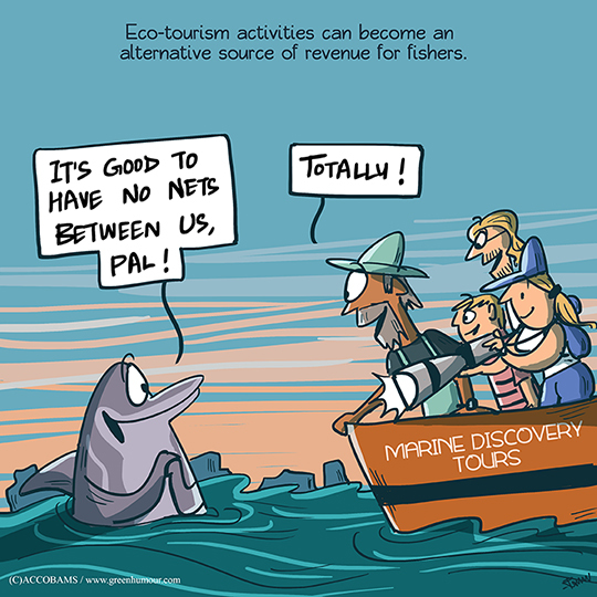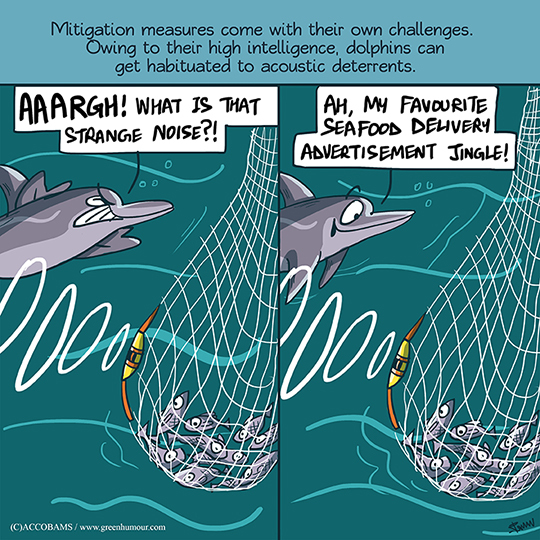 The issue of depredation, i.e. dolphins damaging fishing nets to take fish, has been a growing concern both for cetaceans and fishers in the Mediterranean and the Black Seas. I collaborated with ACCOBAMS (Agreement on Conservation of Cetaceans of Black and Mediterranean Seas) to bring out a set of 9 cartoons that break down the issue of dolphin depredation, and explain how better monitoring and implementation of scientific solutions can help control the problem. The cartoons have been translated to French, Italian, Spanish, Maltese and Arabic, and are being used in publications and multimedia, targeted at ACCOBAMS' partners and funding organizations. Another publication I am working on for ACCOBAMS, a comic + colouring book on the relationship between fishers and dolphins of the Mediterranean and Black Seas, will be out next month.