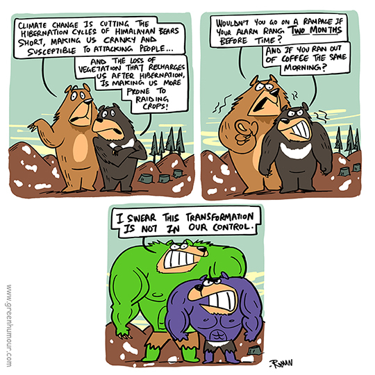 The disruptions in the hibernation cycles of the Himalayan Black and Brown Bears from climate change, are now beginning to disrupt human lives as well. Comic from my column with The Hindu Sunday Magazine.
