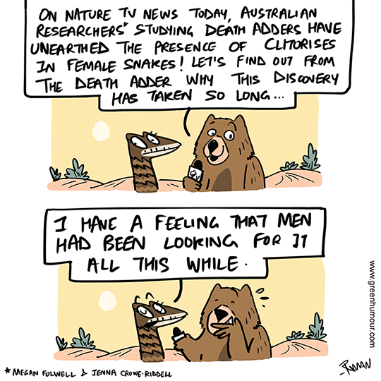 Researcher Megan Folwell seems to have changed herpetology forever by unearthing the presence of two clitorises in a Death Adder, leading to the similar discoveries of varying sizes in other kinds of snakes! What's more: the presence of erectile tissue in the clitoris may be even suggestive of tactile sensitivity!Ah, well, some cartoons just write themselves!