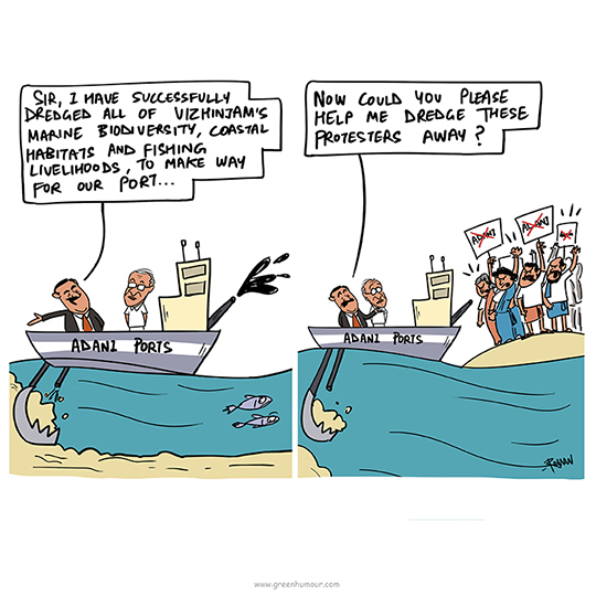 Mongabay piece, Supriya Vohra outlines how loss of marine biodiversity and livelihoods has been accelerating because of the Adani - Kerala Govt. Vizhinjam International Seaport. Since then, protests from the fishing community have intensified, and even painted a religious colour by the Kerala government. Cartoon from my column with The Hindu Sunday Magazine.