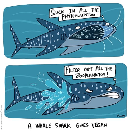 A Whale Shark goes vegan. Cartoon from my Roundglass Sustain column from last year, published after a report by researcher Alex Wyatt had come out about Whale Sharks, the world's largest fish, actually being more vegetarian in their diet than previously thought.