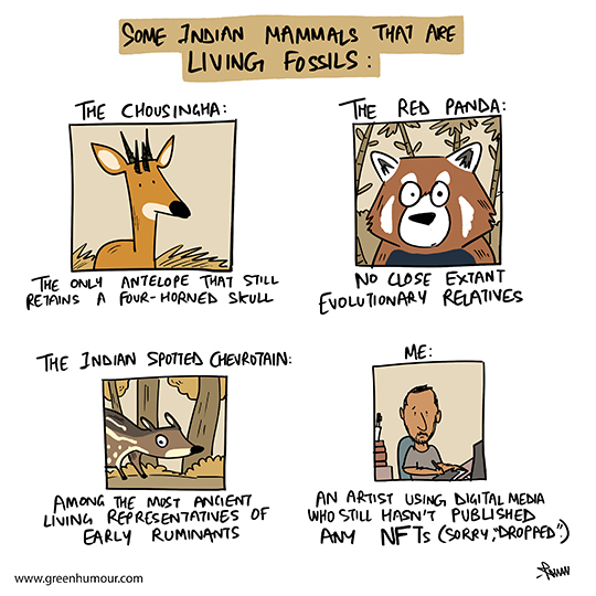Some Indian mammals that are fossil fuels. Comic from my column with The Hindu Sunday Magazine, NOT available as an NFT.