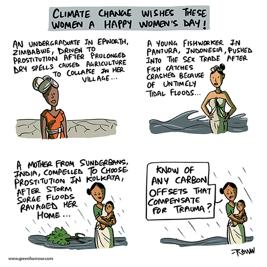 This Women's Day, here's a glance at how climate change is being increasingly linked with rising sex trafficking and prostitution in developing countries that are most prone to climate disasters. Comic from my column with The Hindu.