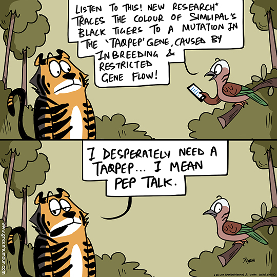 Odisha's famed 'black tigers' from Simlipal Tiger Reserve have long harboured a genetic secret, finally decoded by the eminent biologist Dr. Uma Ramakrishnan and Vinay Sagar from the NCBS. The genetic mutation is linked to inbreeding and restricted gene flow. Cartoon from my Roundglass Sustain column.