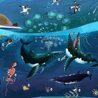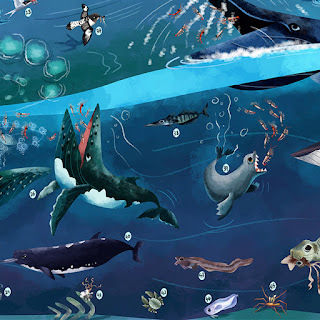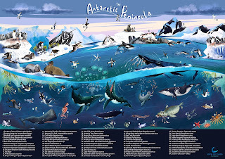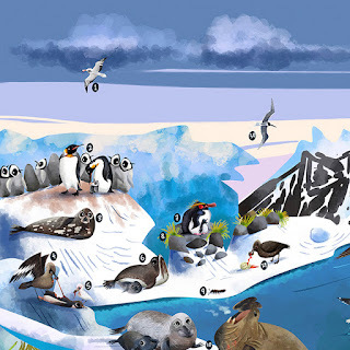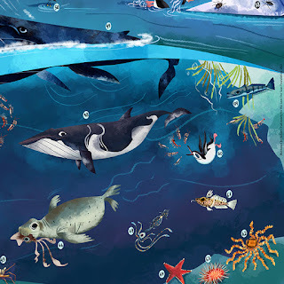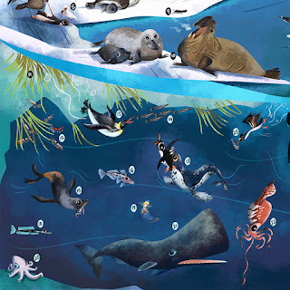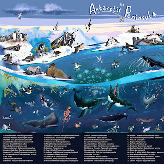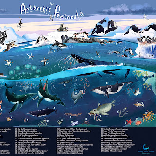 (click on the image for a larger view)Commonly perceived as uninhabitable and desolate, the Antarctic Peninsula is actually teeming with south polar wildlife, most of which is threatened by climate change today. A unique ecosystem where all food is derived from the sea, the biome harbours creatures as tiny as krill (that form the core of the food web) and as large as the Blue Whale! The terrestrial wildlife of the Antarctic Peninsula is no less splendorous, with five species of penguin, and seal diversity that ranges from the penguin-hunting Leopard Seals, to the gigantic Southern Elephant Seals that can dive upto 1550m to hunt squids! The illustration focuses on how life in Antarctica revolves around krill: Humpback Whales bubble net them, Blue Whales lunge-feed on them, Crabeater Seals have evolved specialized dentitions to hunt them, penguins dive after them, and storm petrels skim the sea surface with their feet in search of them! And if you're wondering why the ice at the penguin colonies looks pink, that too is from the colour that a krill based diet imparts to their poop!